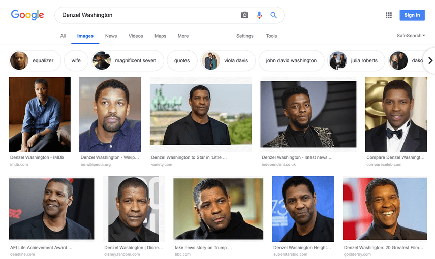 In the previous section, we mentioned that search engines will be ranking the pages the images are on. Let's take an example to illustrate this. If you search for Denzel Washington in Google images search , this is what you'll see: