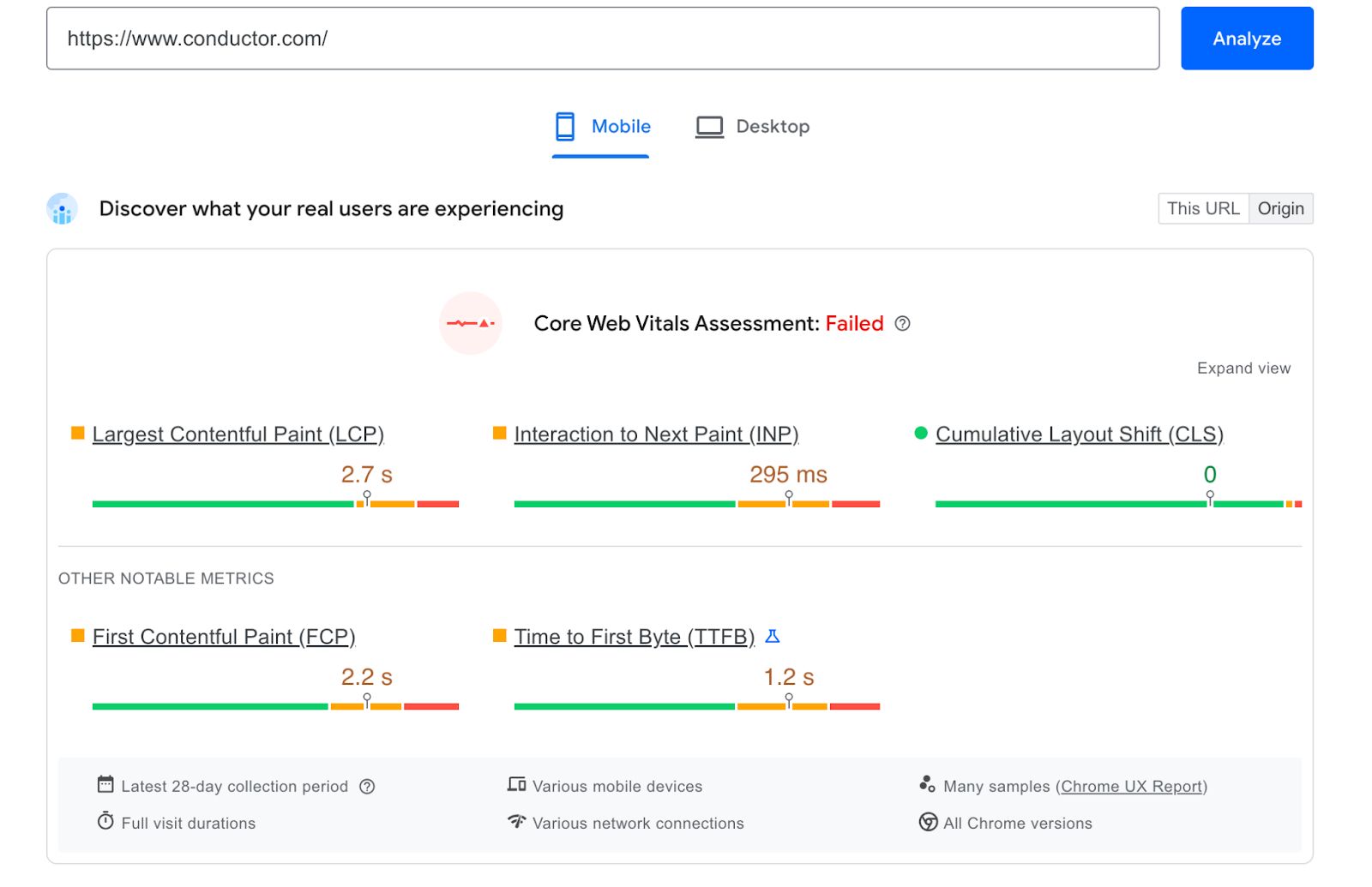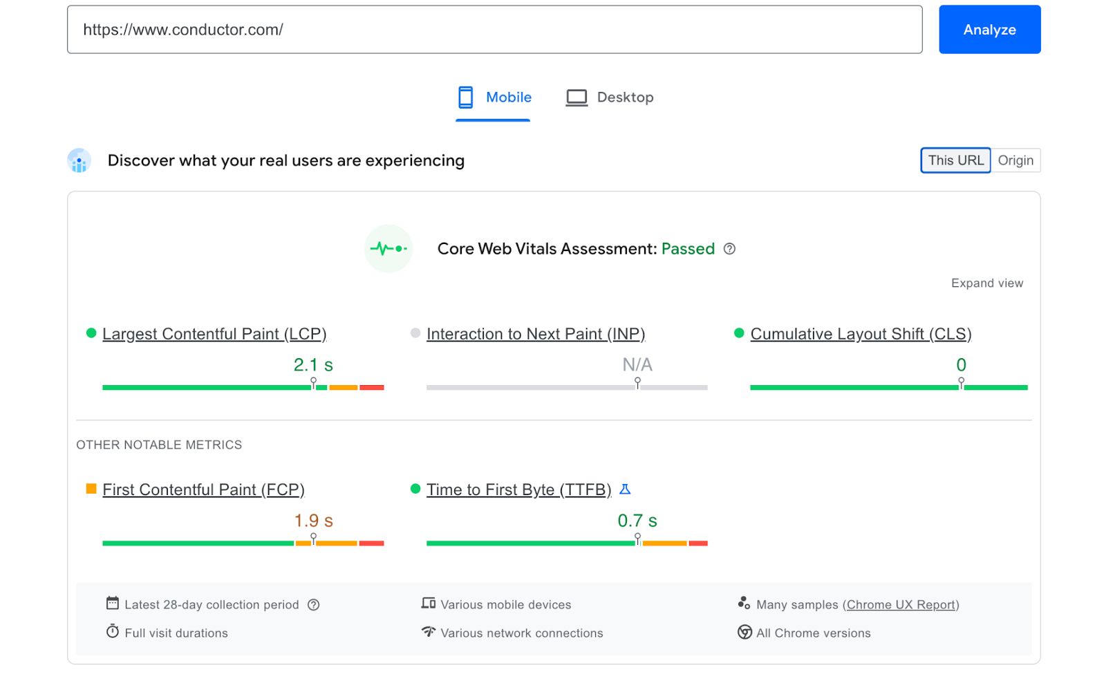 When it comes to Core Web Vitals, the Conductor Monitoring platform monitors your site's Origin Summary (field data) and Lighthouse metrics (lab data) for all of your pages.