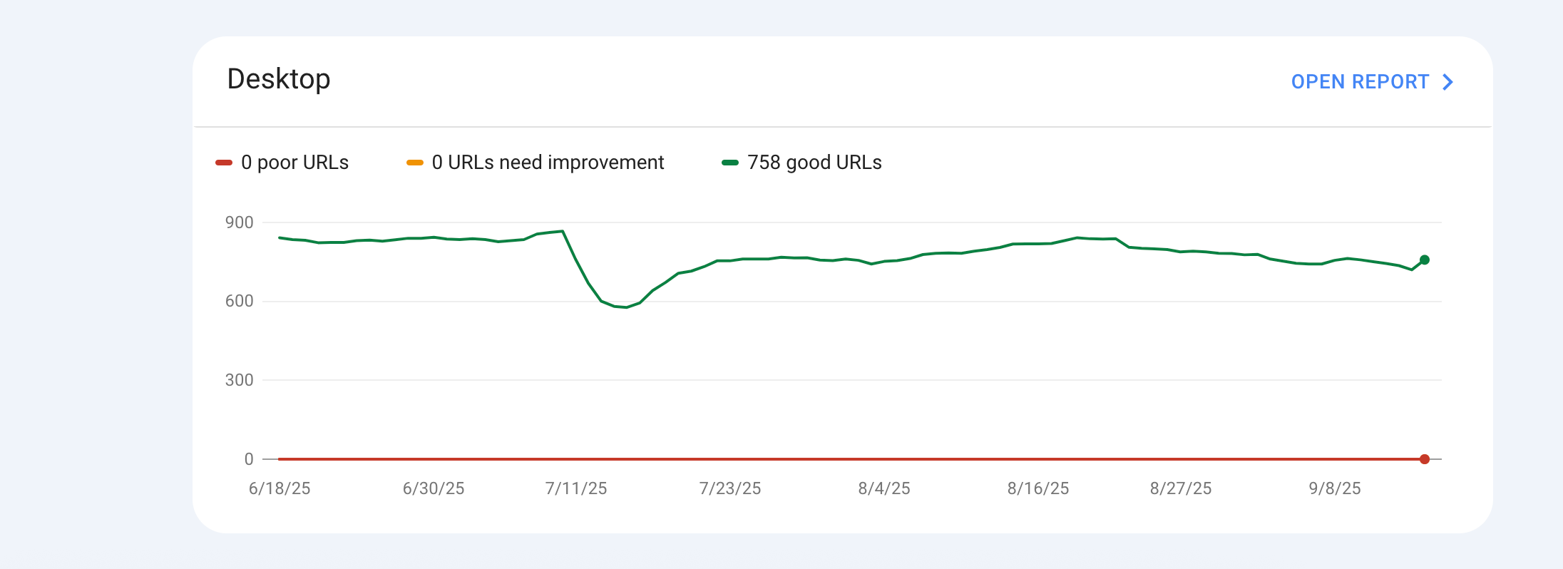 When you click on Open report for either Mobile or Desktop, this displays a more detailed view of your Core Web Vitals performance for that device type. If we click Mobile, this is what we see: