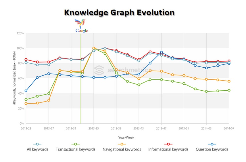 The graph shows the evolution of Knowledge Graph integrations in each keyword category – normalized to a maximum value of 100%. It is clear that, immediately after the Hummingbird release, all SERPs keywords categories returned more Knowledge Graph overlays than before (i.e more keywords had KG integration), with the exception of keyword searches as questions. As Hummingbird proliferated, however, the number of KG integrations increased in all categories, including keyword searches as questions that also increased.