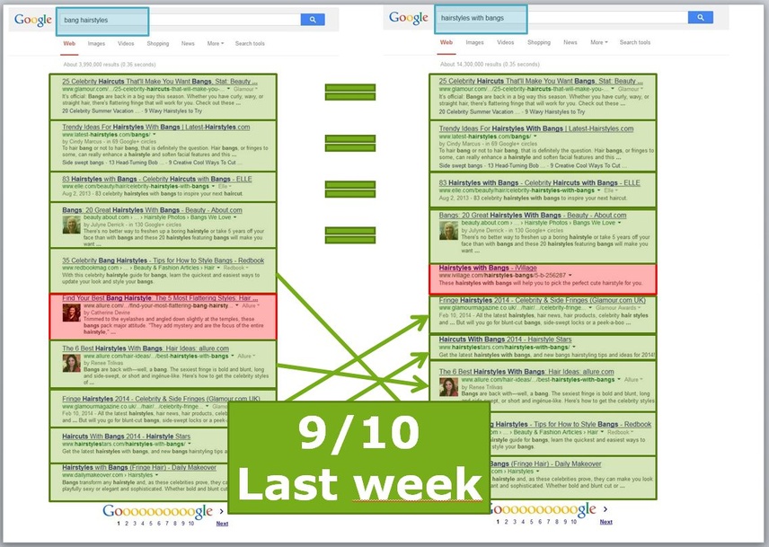 Searchmetrics measured the consistency of search results for keyword pairs from a representative keyword set. The analysis examined a number of queries that were semantically highly identical (for example: “bang hairstyles” v’s “hairstyles with bangs”). The analysis was performed at three data points – just before Hummingbird (07/2013), shortly after Hummingbird (10/2013) and in January 2014.
