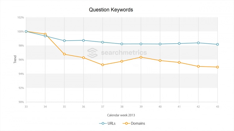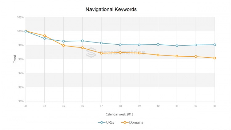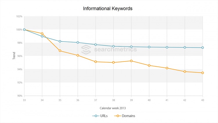 It can be clearly seen that the diversity of search results has decreased by a total of about 6% since the introduction of Hummingbird. This affects navigational keywords less (by almost 4%) than informational keywords, as well as interrogative keywords (also by about 6%).