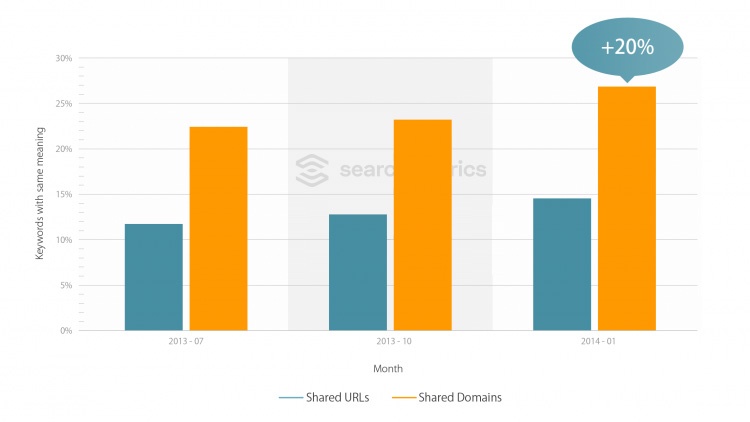 Result: As can be seen from the graph, search result matches for semantically similar keyword pairs has increased by nearly 20%. This is best illustrated by an example. Here, Searchmetrics had the pre-Hummingbird rankings reconstructed from its own database and compared with current rankings.