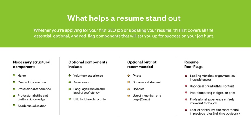 Whether you’re applying for your first SEO job or looking to improve or refresh your SEO resume, the list below covers all the essential, optional, and red-flag components that will set you up for success on your job hunt.