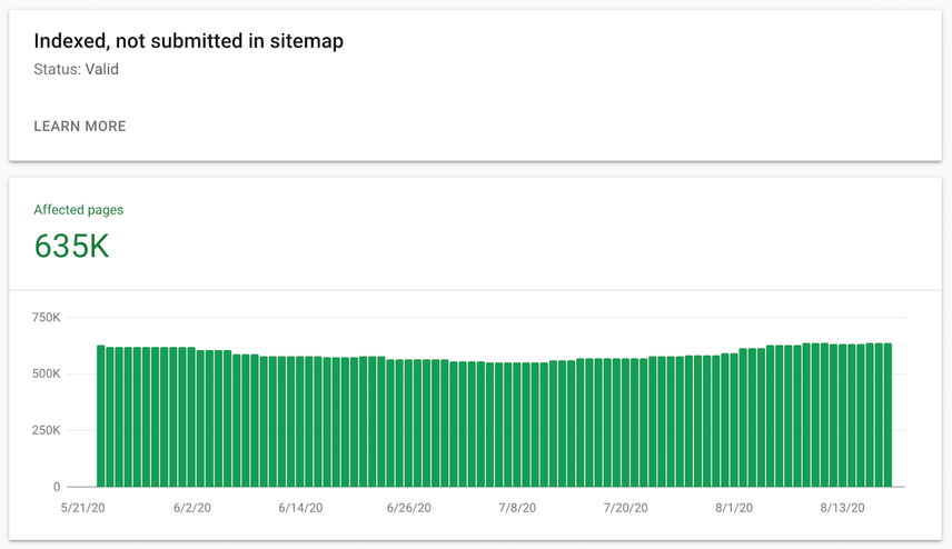 The “Indexed, not submitted in sitemap” status indicates that Google's indexed URLs that aren't included in your XML sitemap.