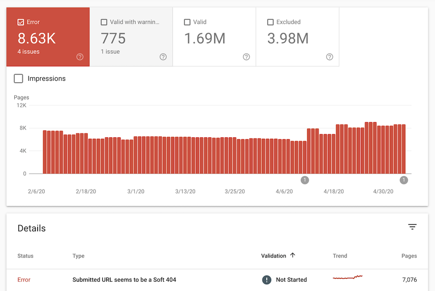 This is what the Google Search Console’s Index Coverage report on soft 404 errors looks like: