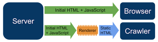 Dynamic Rendering means that a server responds differently based on who made a request. If it’s a crawler, the server renders the HTML and sends that back to the client, whereas a visitor needs to rely on client-side rendering.