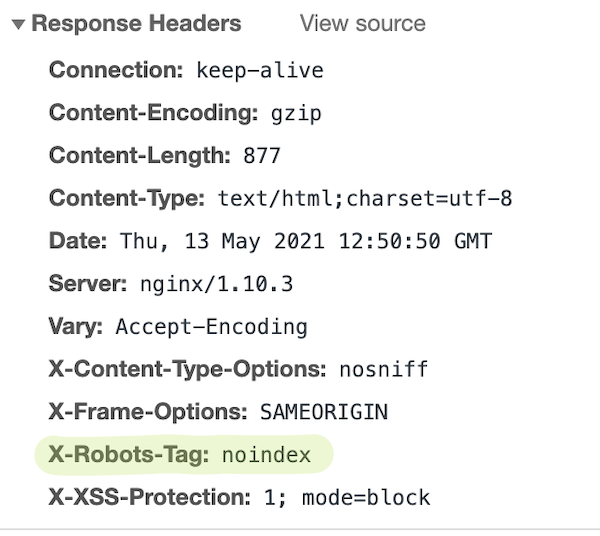 can be included in the HTTP Headers. Here’s a screenshot of a page’s HTTP response headers taken from Chrome Web Inspector, for a page that contains a X-Robots-Tag: noindex