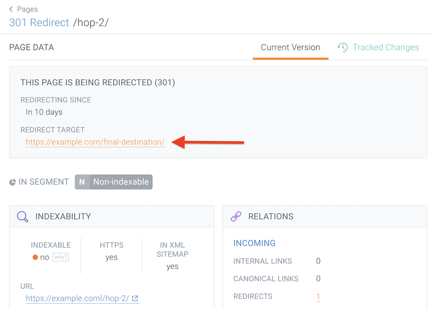 If you receive the ERR_TOO_MANY_REDIRECTS error for a particular URL, check where the URL is redirecting you to. Look up the URL in ContentKing, and take note of the Redirect target: