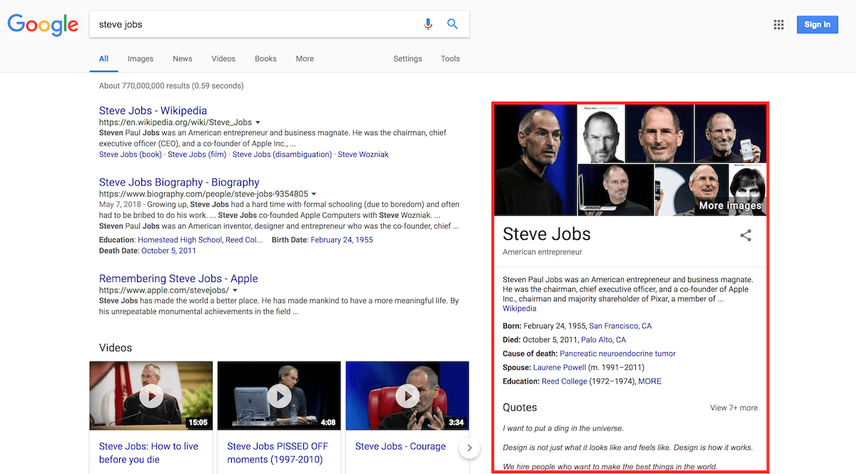 A knowledge graph card, the block on the right hand side of a search engine result page, is basically the enhanced snippet of an organization. And these aren't easily earned, as they're mostly reserved for well-known brands such as Apple and Mercedes-Benz and for online businesses such as Mashable.