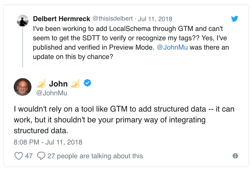 SEO Experts love implementing Schema markup through Tag Managers, because it doesn't require having to go through development to implement it. However, we don't recommend adding Schema markup using Tag Managers, because this relies on JavaScript to be executed, and Google has limited resources available for this. In practice, this means that it will take a lot longer for your Schema implementation to be picked up and shown by search engines. After you make changes, it will again take a lot longer compared to implementing it directly in HTML. On top of that, several search engines - Yahoo, Yandex, and Baidu - don't execute JavaScript at all. It appears as if Bing is slowly starting to execute Javascript, but they are still far from where Google is right now in terms of their scale and abilities.