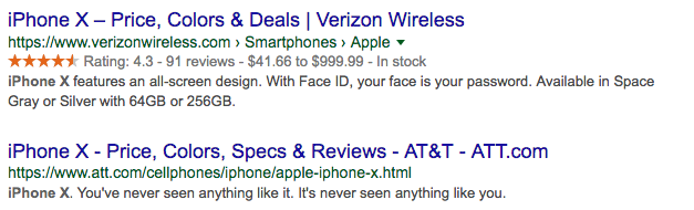 A familiar example of an enhanced snippet is one that includes review data. Take for example these two snippets in Google: