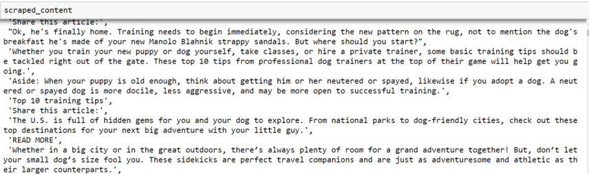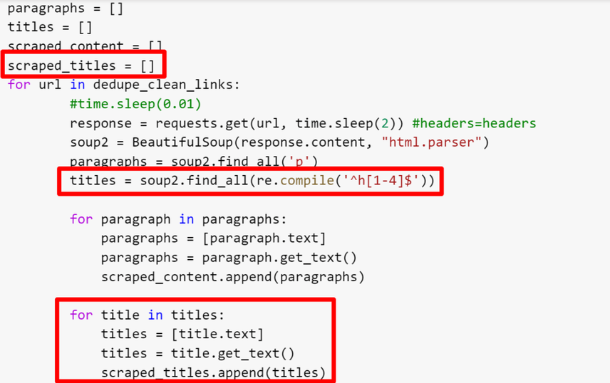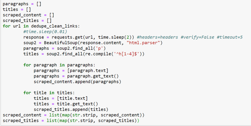 We will use a ‘for loop ‘ to iterate through that list of URLs and capture all of the paragraph tags and all H1-H4 tags in a ‘dictionary ‘. Think of this as a document in our script where the content from ranking URLs is going to be stored. It is this ‘document’ containing our extracted website copy that we will be analysing: