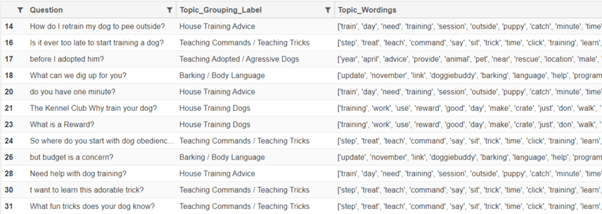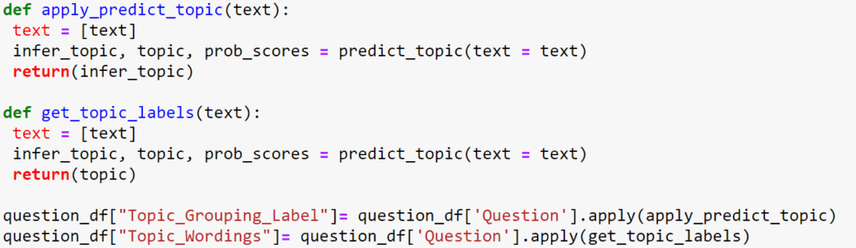 The first will read the text of the question then match that to a topic and pull the ‘topic label’ into our dataframe (remember the label names you assigned in the topic modeling workflow). The second function will then pull through the words from that topical grouping.