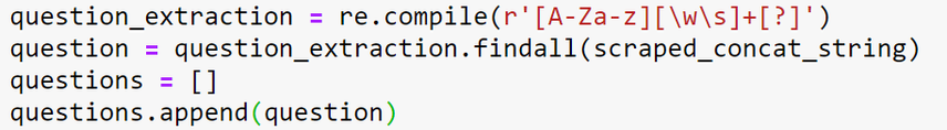 This is probably my favorite piece of analysis we can run through this script. What this part of the script will do is pull a list of questions in our copy (using a regex statement that looks for the start of a sentence that ends in a question mark).