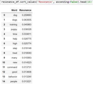 The output is a dataframe that contains a word and its resonance to the topics we are searching for: