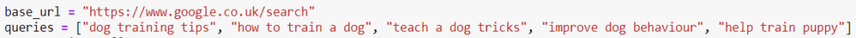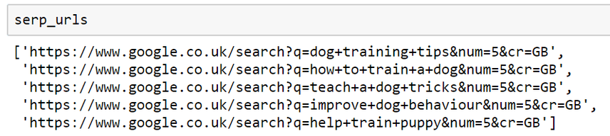 The script will then compile a list of ‘SERP URLs’ that we want to analyse for those keywords. In this example, we’re asking it to look at the top five results (&num=5) for UK search results (&cr=GB).