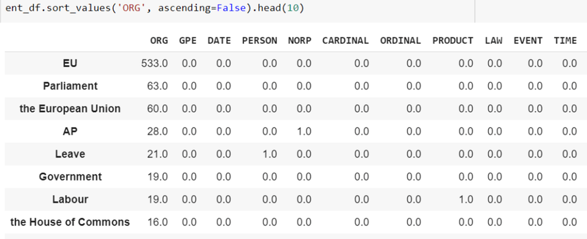Our output dataframe shows each of the entities it has found in a row, then the columns show a count of how many times that entity has been found based on its label.