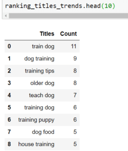 Again, we get some pretty interesting insights into what the best approach might be to optimise our page titles. For example, we see the word ‘tips’ being used a lot, as well as headers that speak to the age of the dog, house training, and dog food (presumably as an incentive).