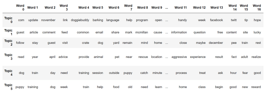 These ‘topics’ are going to be represented as a collection of words that can be seen in the dataframe thats looks like this: