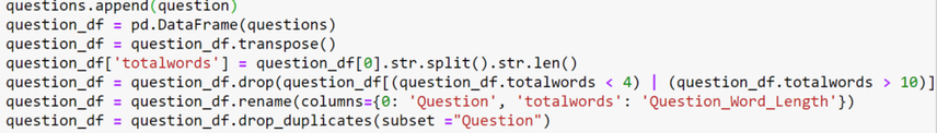 It compiles the extracted list of questions in a dataframe that looks at some basic logic to eliminate anything that is obviously ‘noise’.