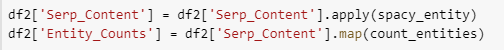 Here is a list of all the various ‘entity types’ that Spacy can find in your content. The script will then count how many times each named entity occurs so it can compile the dataframe you see above.