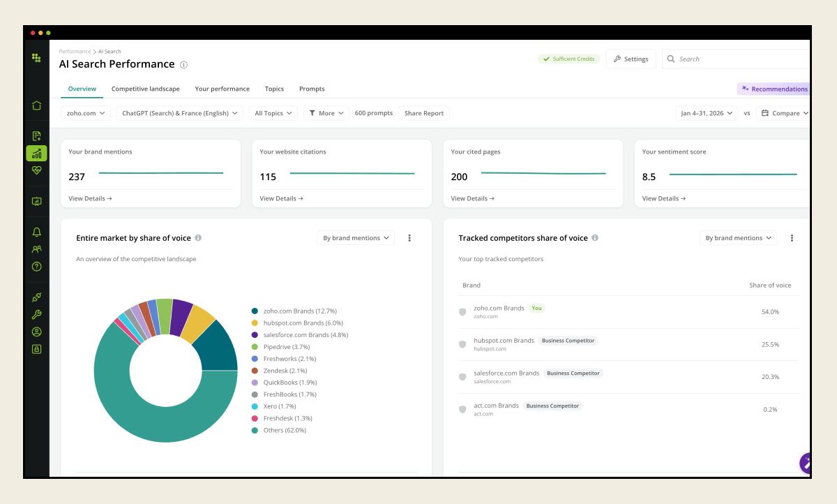 The redesigned report is structured into three views — Overview, Competitive Landscape, and Your Performance. Each is built to answer specific strategic questions, not surface generic data in an overloaded dashboard. Every metric is powered by synthetic prompts calibrated to your actual buyer personas and how they search across LLMs.