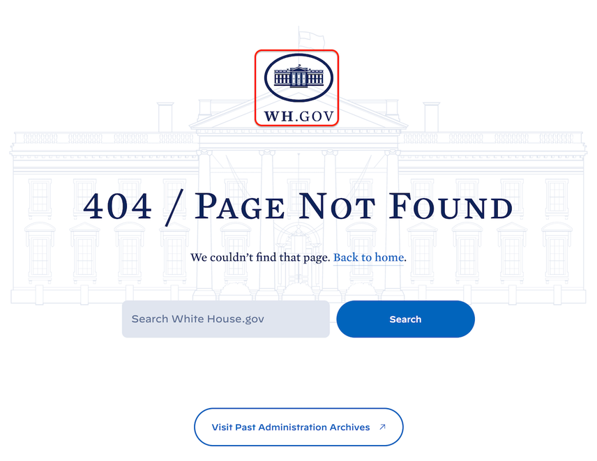 - The White House’s logo on the 404 page isn’t linked to the homepage.