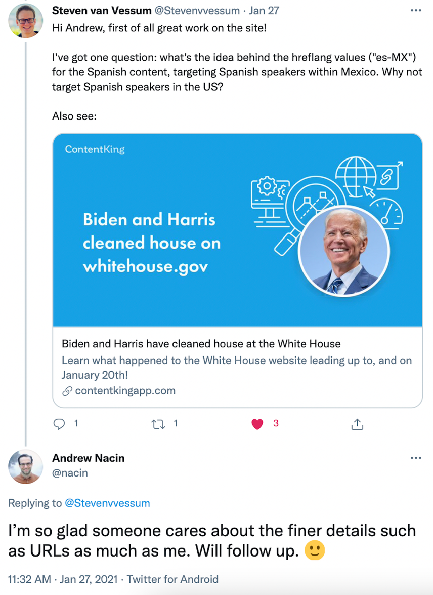 If anyone on the White House team is reading this; we're glad to see that you're continuously making improvements to the website. If you're interested in taking the SEO Quality Assurance process to the next level — our initial offer still stands. Reach out to us through the support chat on the bottom and we'll provide you with a free Conductor Website Monitoring account.