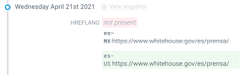Fast forward to a few months later, we receive a ContentKing alert that the hreflang value was changed to our suggestion of es-US