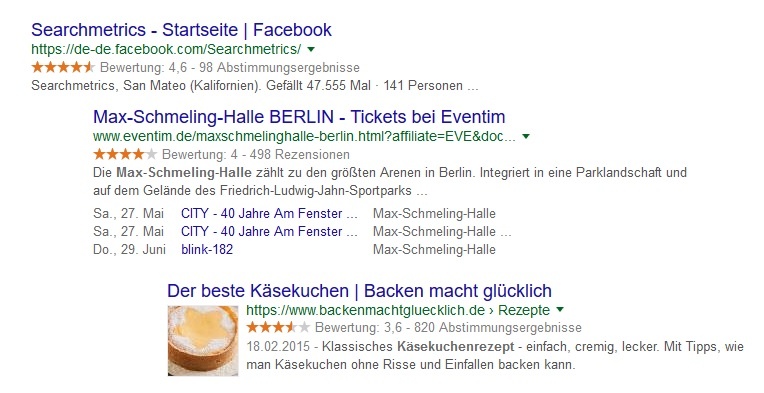 Durch Rich Snippets wird die Aufmerksamkeit der User auf das eigene Suchergebnis gelenkt. Zugleich können Rich Snippets in Form von Bildern oder Event-Daten einen zusätzlichen Mehrwert bieten. Erweiterte Informationen durch Rich Snippets werden sowohl in der Mobile als auch in der Desktop Search angezeigt.