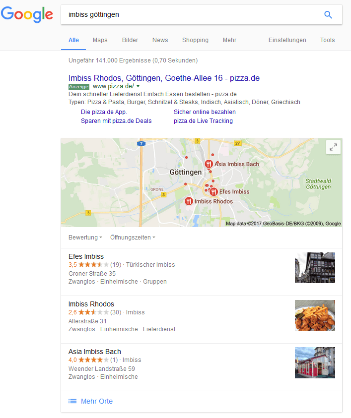 Maps befinden sich am häufigsten, aber nicht ausschließlich, bei Suchen auf Mobilgeräten, wo die direkte Verknüpfung zur Google Maps App hergestellt wird. Diese Box wird vor allem dann angezeigt, wenn die Suchanfrage einen lokalen Bezug hat, wie im Beispiel: Suchergebnisseite für “imbiss göttingen”