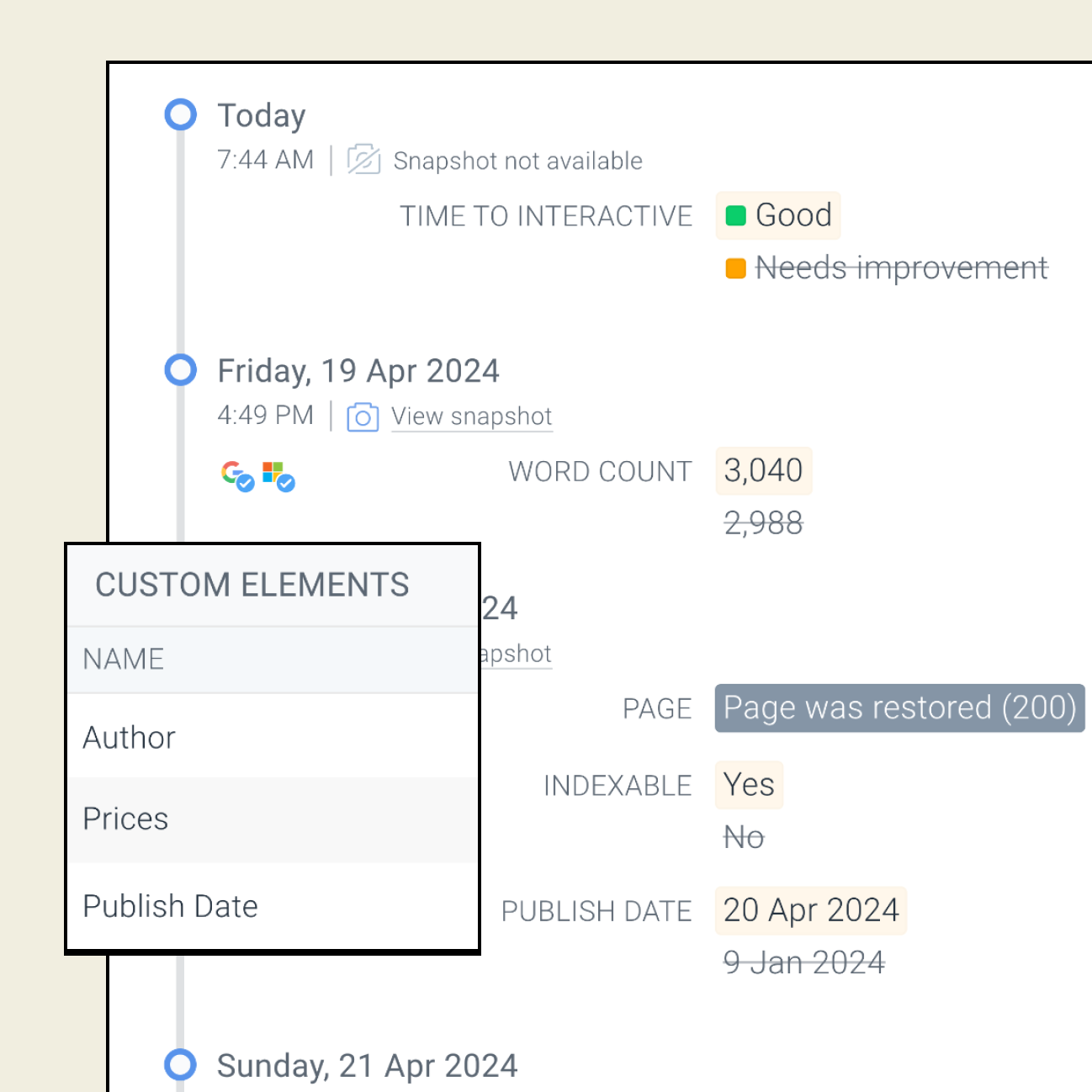 Erstellt vollständig benutzerdefinierte Regeln, um jedes Element auf eurer Website zu überwachen und zu verfolgen, damit ihr Inhalte, Produktseiten, Markenstandards und die Einhaltung rechtlicher Vorschriften einfach verwalten könnt. Außerdem habt ihr Zugriff auf ein vollständiges Änderungsprotokoll und könnt proaktive Warnmeldungen einrichten, damit ihr nie im Dunkeln tappt.