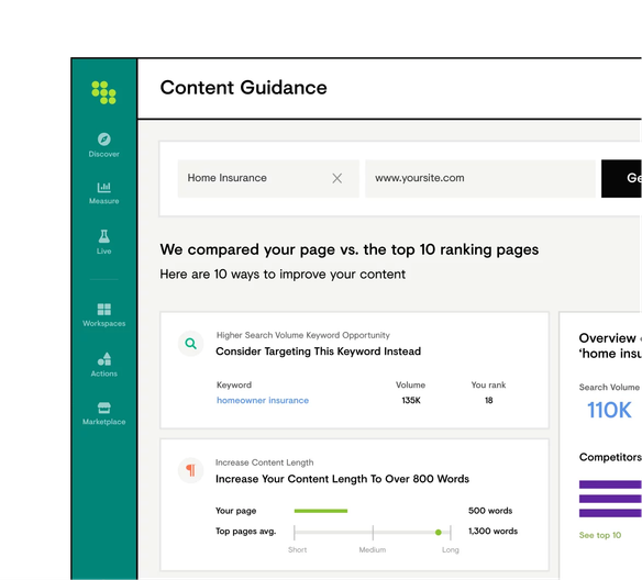 Content Guidance gehört zu meinen meistgenutzten Tools auf der Conductor-Plattform. Ich kann eine URL von der Website in die Funktion „Content Guidance“ einfügen. Dann kann ich genau sehen, wo wir die Erwartungen übertreffen und wo wir im Vergleich zu unseren Mitbewerbern noch Verbesserungspotenzial haben. So kann ich entsprechende Aktualisierungen vornehmen.