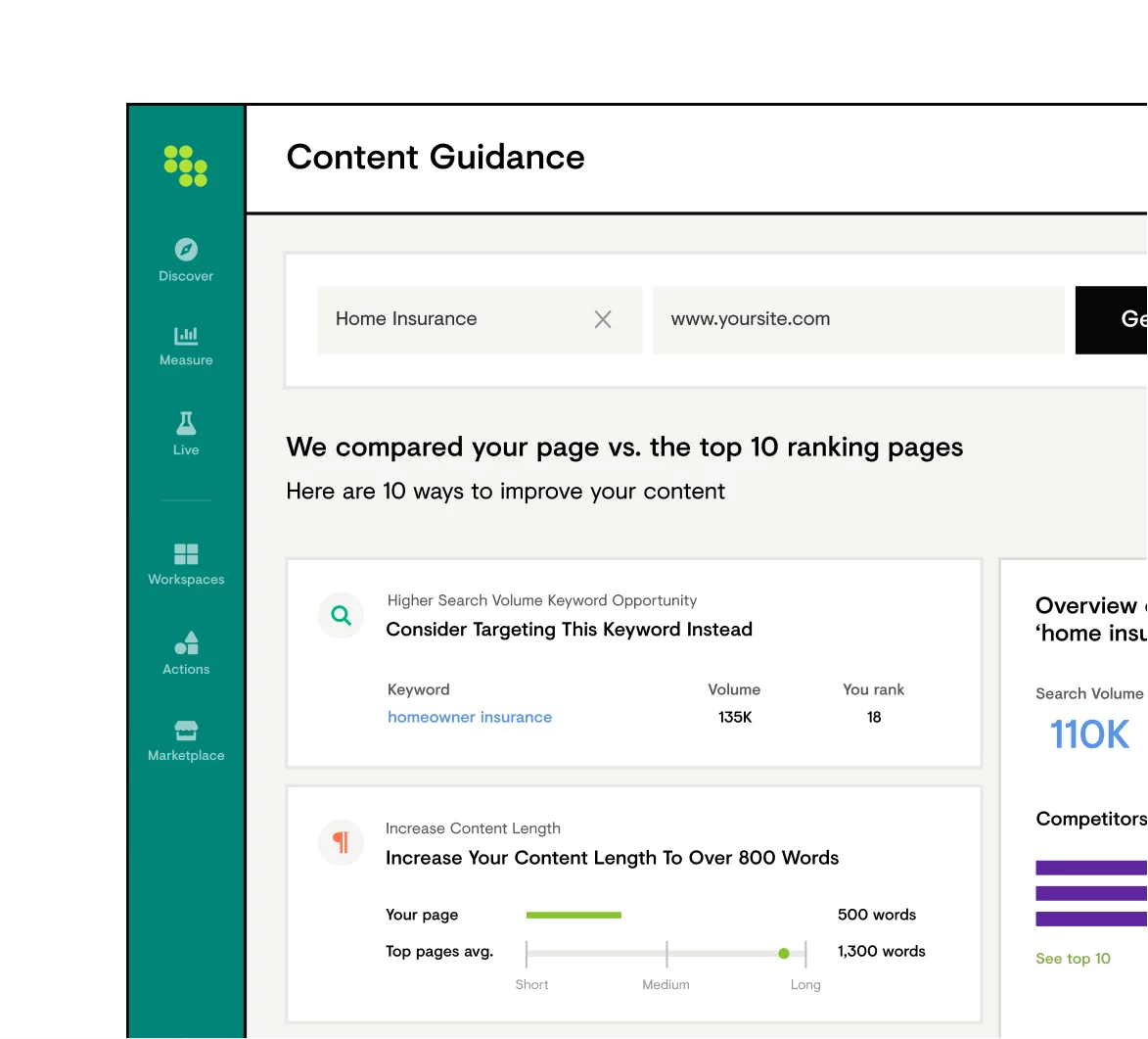 Content Guidance gehört zu meinen meistgenutzten Tools auf der Conductor-Plattform. Ich kann eine URL von der Website in die Funktion „Content Guidance“ einfügen. Dann kann ich genau sehen, wo wir die Erwartungen übertreffen und wo wir im Vergleich zu unseren Mitbewerbern noch Verbesserungspotenzial haben. So kann ich entsprechende Aktualisierungen vornehmen.