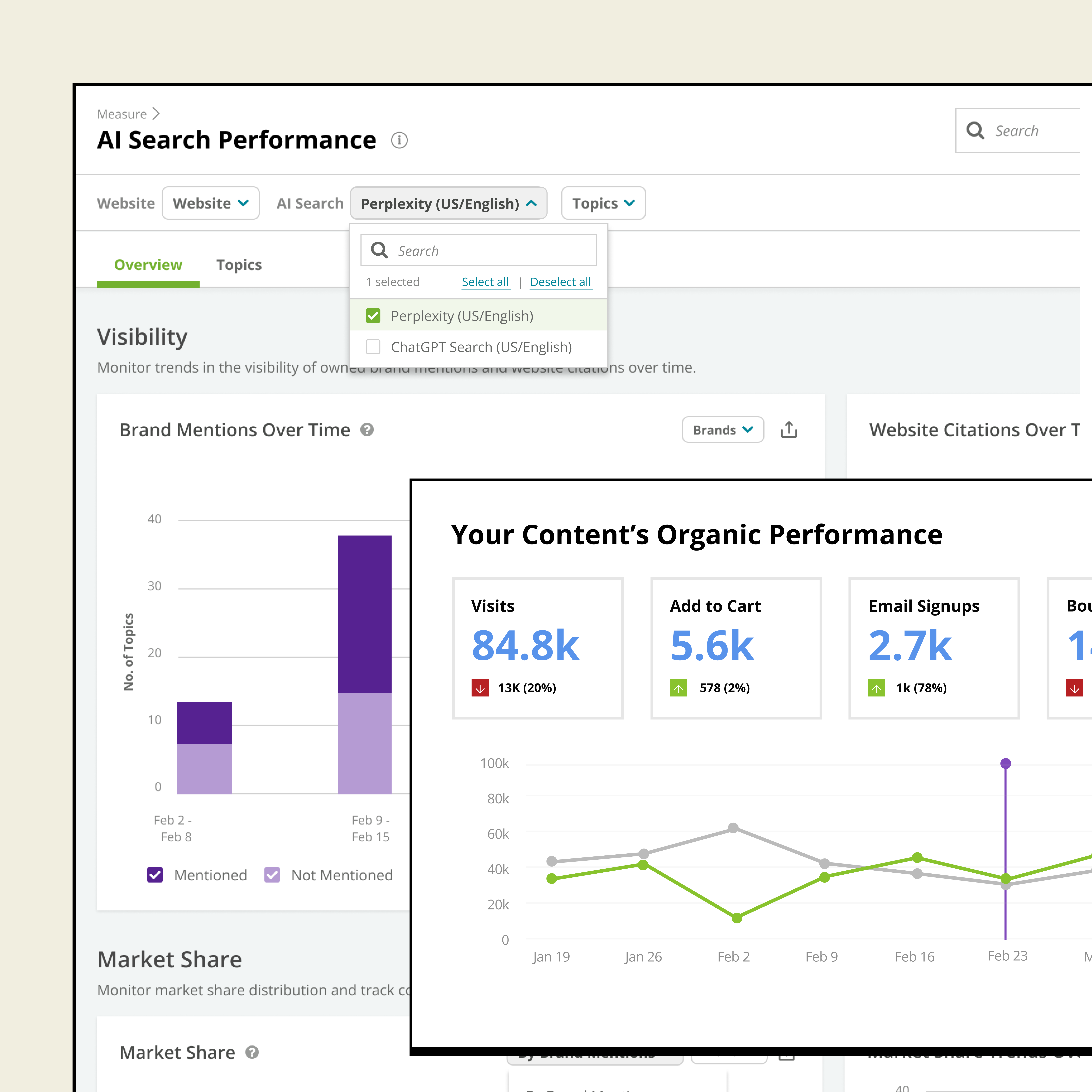 Kombiniere Insights aus klassischer und KI-Suche in einer Plattform – für eine zukunftsfähige Strategie. Maximiere deine Sichtbarkeit, sorge für ein konsistentes Markenerlebnis und erreiche deine Zielgruppe überall dort, wo sie sucht.