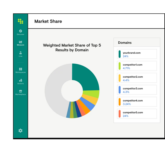Meistere die SEO-Konkurrenzanalyse, indem du deinen Suchmarktanteil nach Kategorie, Ergebnistyp, Rangposition, Standort, Gerätetyp und mehr trackst. Analysiere alles mit direkten Vergleichen deiner größten direkten Mitbewerber und identifiziere indirekte Mitbewerber.