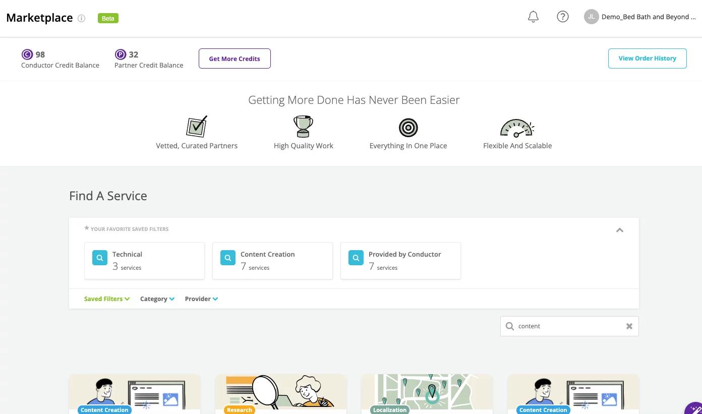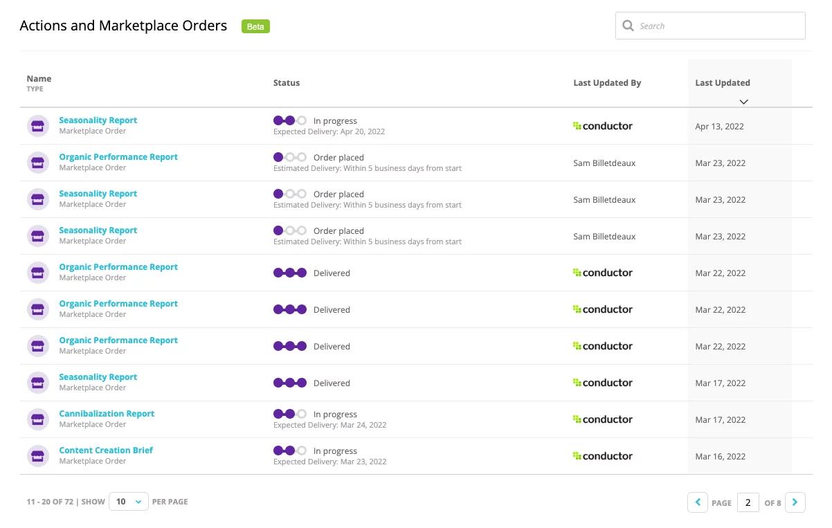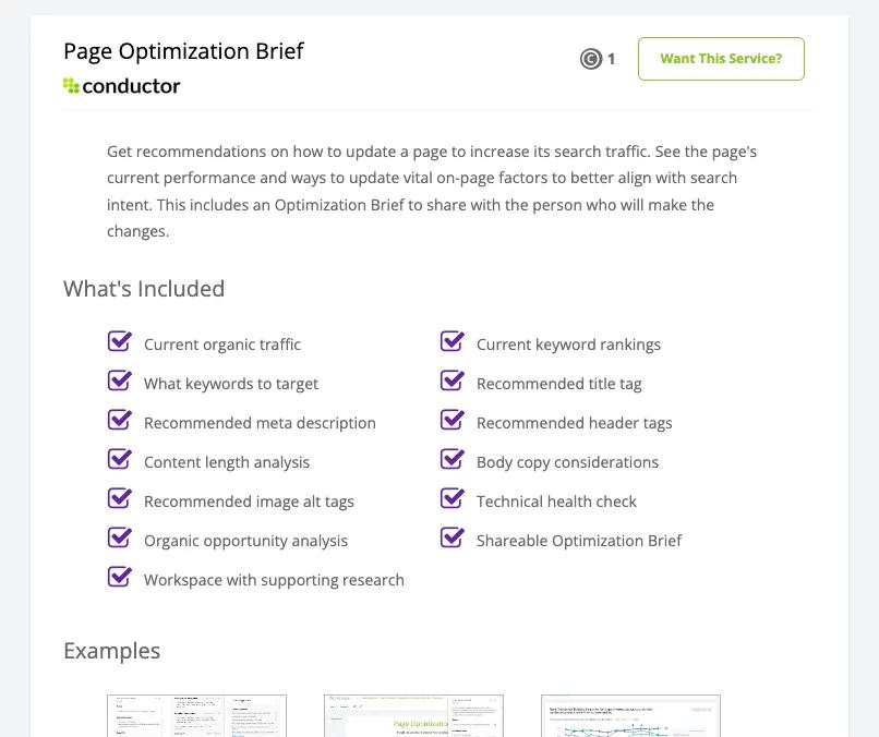 Erreiche deine SEO-Ziele mit Marketplace-Services, die von Conductor-Profis sorgfältig ausgearbeitet wurden, um Wirkung zu erzielen – von der Recherche über die Implementierung bis hin zur Messung.