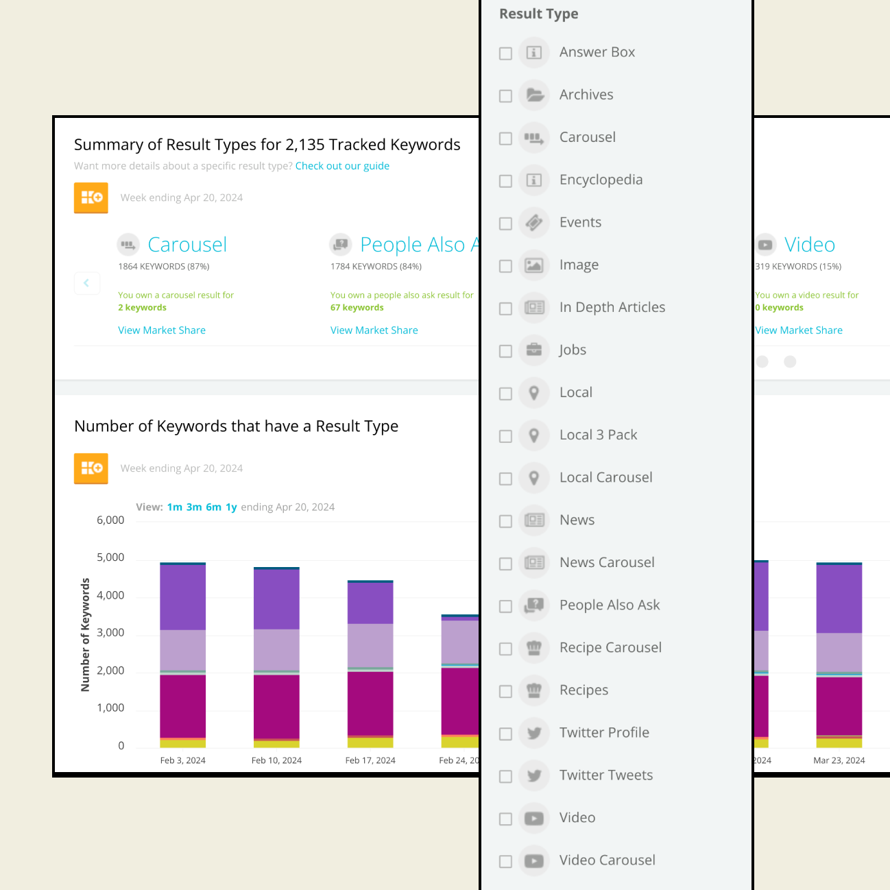 Erfahre, welche Arten von Ergebnissen, wie z. B. Bilder, Videos, Tweets und Antwortfelder, für die von dir gewünschten Keywords angezeigt werden.