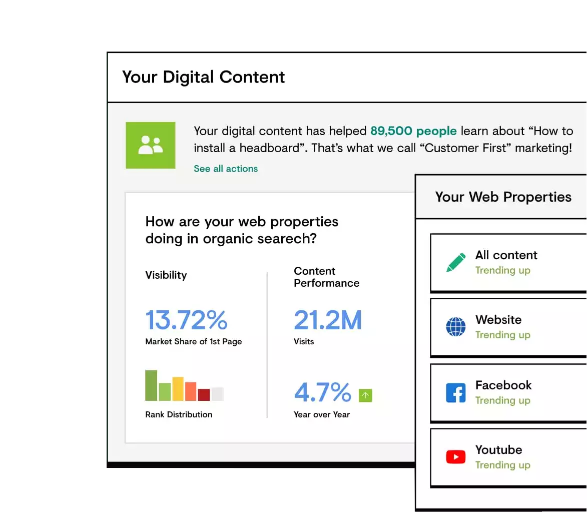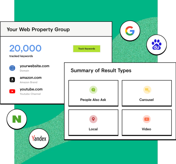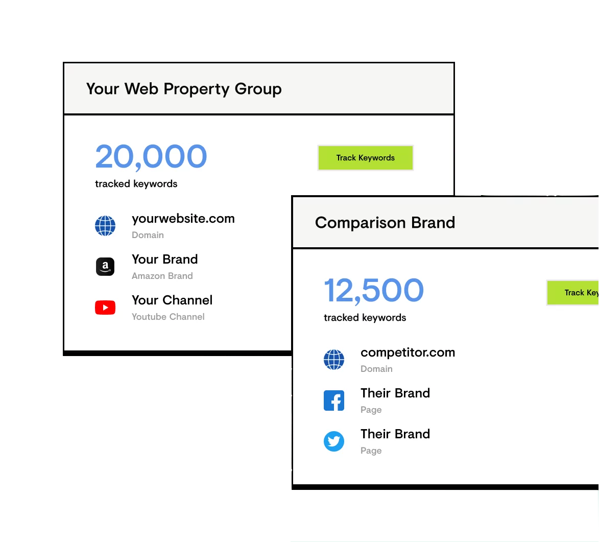 Tracke die Sichtbarkeit jedes einzelnen digitalen Assets, von Domains über Social-Media-Seiten bis hin zu Amazon-Einträgen in Suchmaschinen. Du siehst deine Rankings in jedem Markt und auf jedem Gerät und kannst deine Kundinnen und Kunden dann dort erreichen, wo sie suchen.