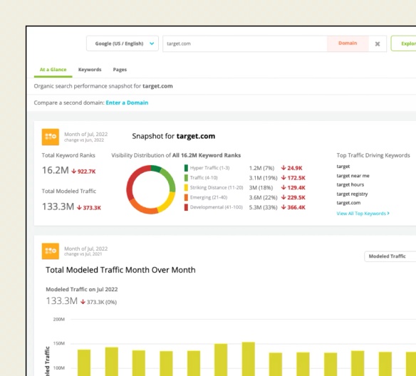 Instantly analyze any site’s organic channel performance. Survey top traffic-driving pages, identify what keywords they rank for, see recent gains and losses, and more.