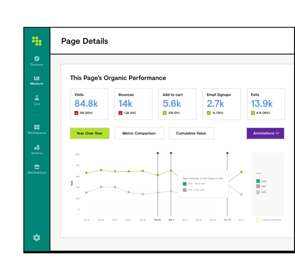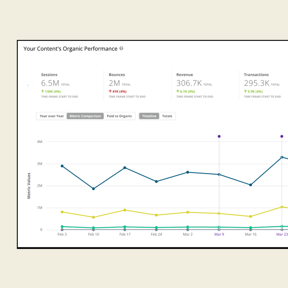 Connect your team’s organic marketing efforts to impact with annotations that automatically detect content and metadata changes, along with any custom events that may have impacted performance.