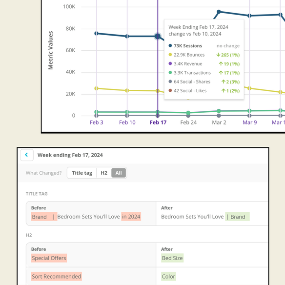 Better understand what’s driving your performance with integrated website analytics, Google Search Console metrics, year-over-year views, and automated change detection in one place.