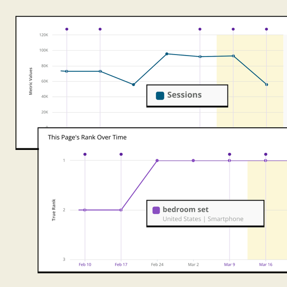 View insights around keyword ranks directly alongside web analytics performance across both discovered and tracked keywords and across any search engine, device, or location.