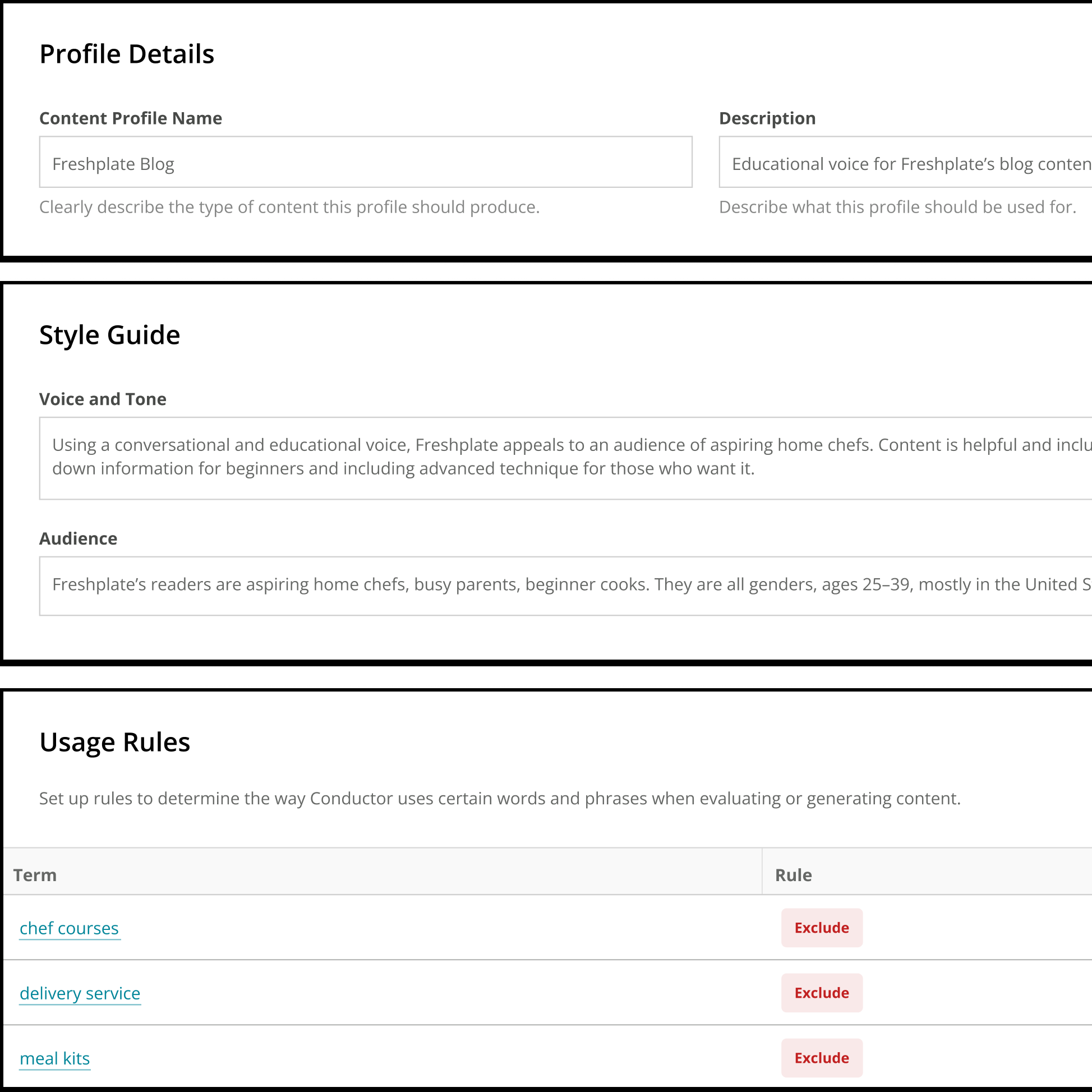 Apply your brand guidelines automatically across teams and content formats with profile-based content generation.