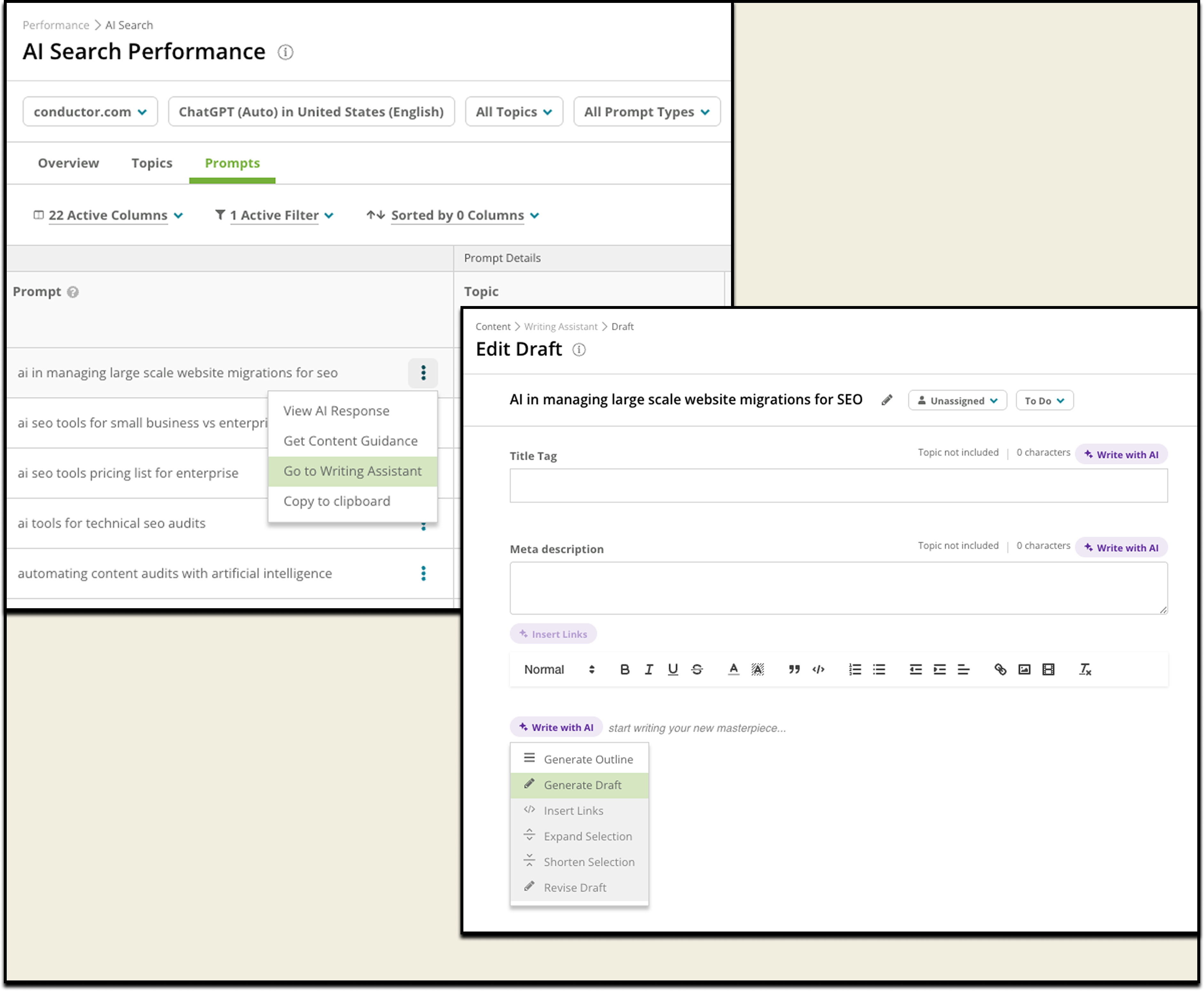 When you identify a critical visibility opportunity in our AI Search Performance report—such as a high-value prompt where a competitor is earning the citation—you can act on it instantly. With a single click, you can send that prompt and all its associated data directly into a new Writing Assistant draft or content brief within Conductor Creator.