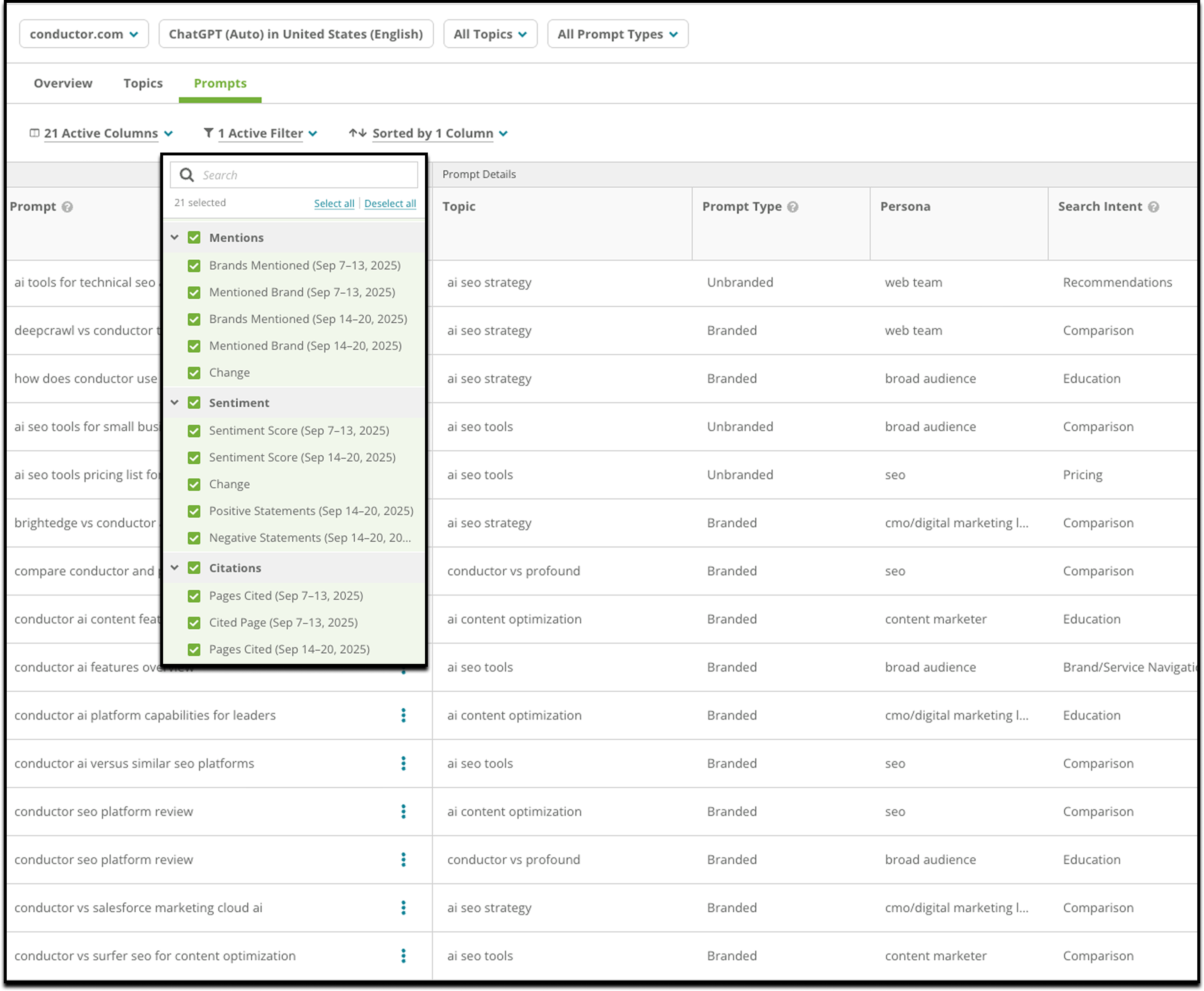 - Prompt Classification: See the prompt's parent topic, its type (Branded vs. Unbranded), the persona it aligns with, and the specific search intent our AI has identified.