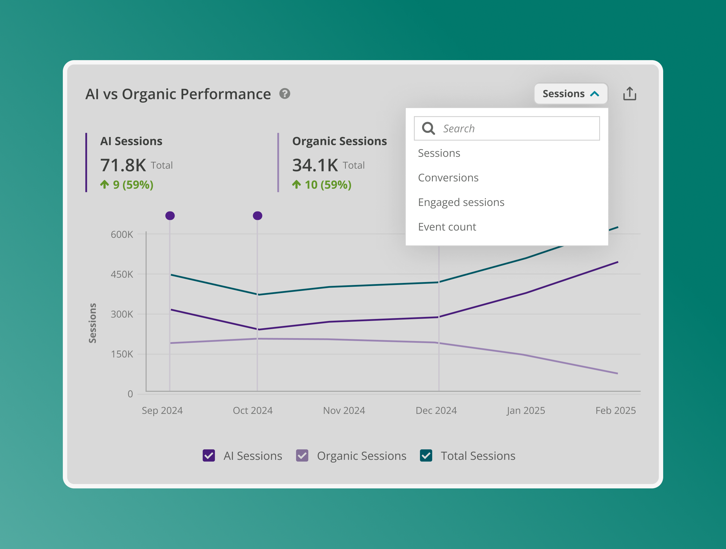 Conductor is the only platform that breaks open this black box. By integrating directly with your web analytics (like Google Analytics 4), we provide a complete, unified view of your AI-driven performance. We don't separate traffic from conversions; we show you the entire customer journey, from initial AI visibility to final business outcome. This allows you to analyze the full spectrum of performance metrics—sessions, engagement, conversions, and revenue—all in one place.