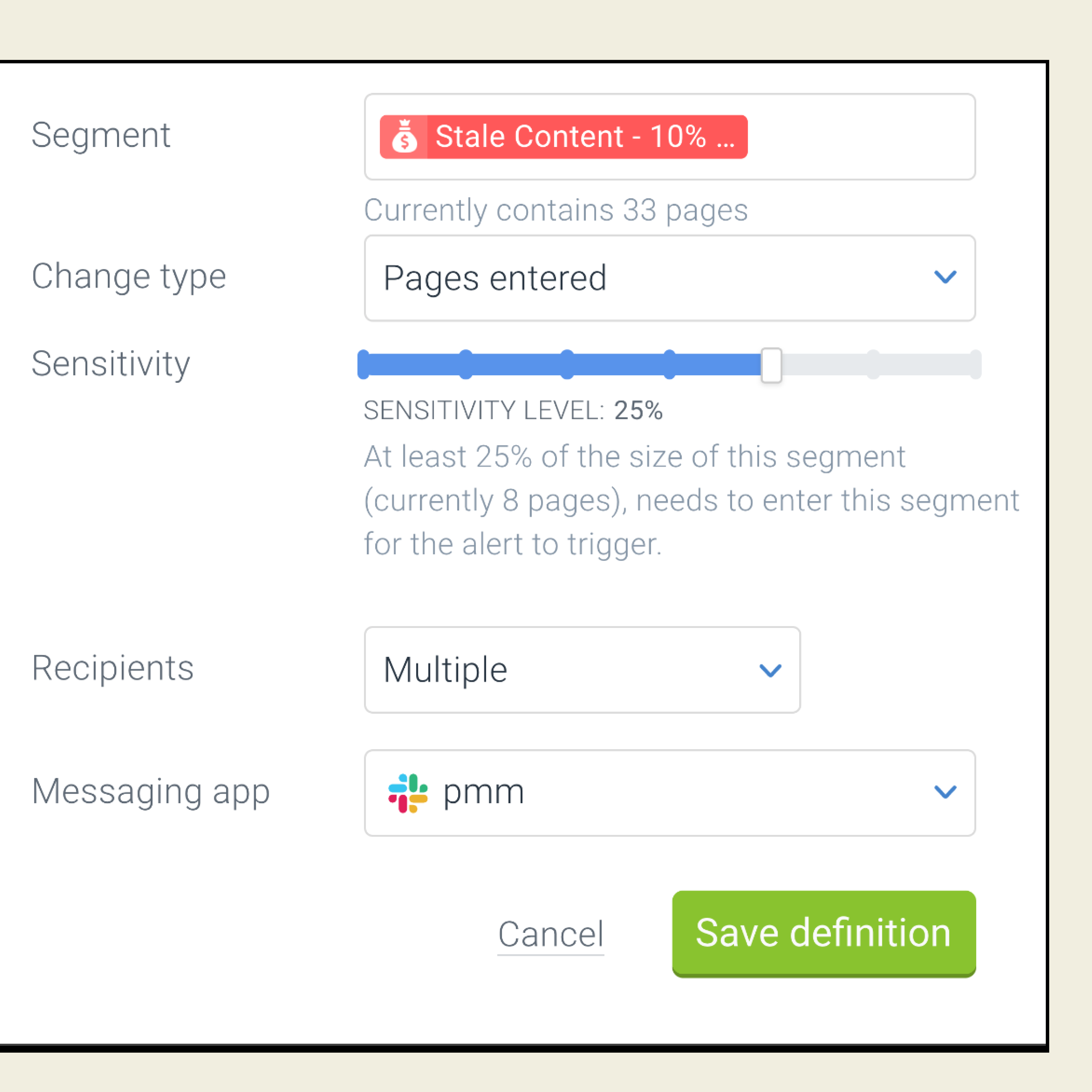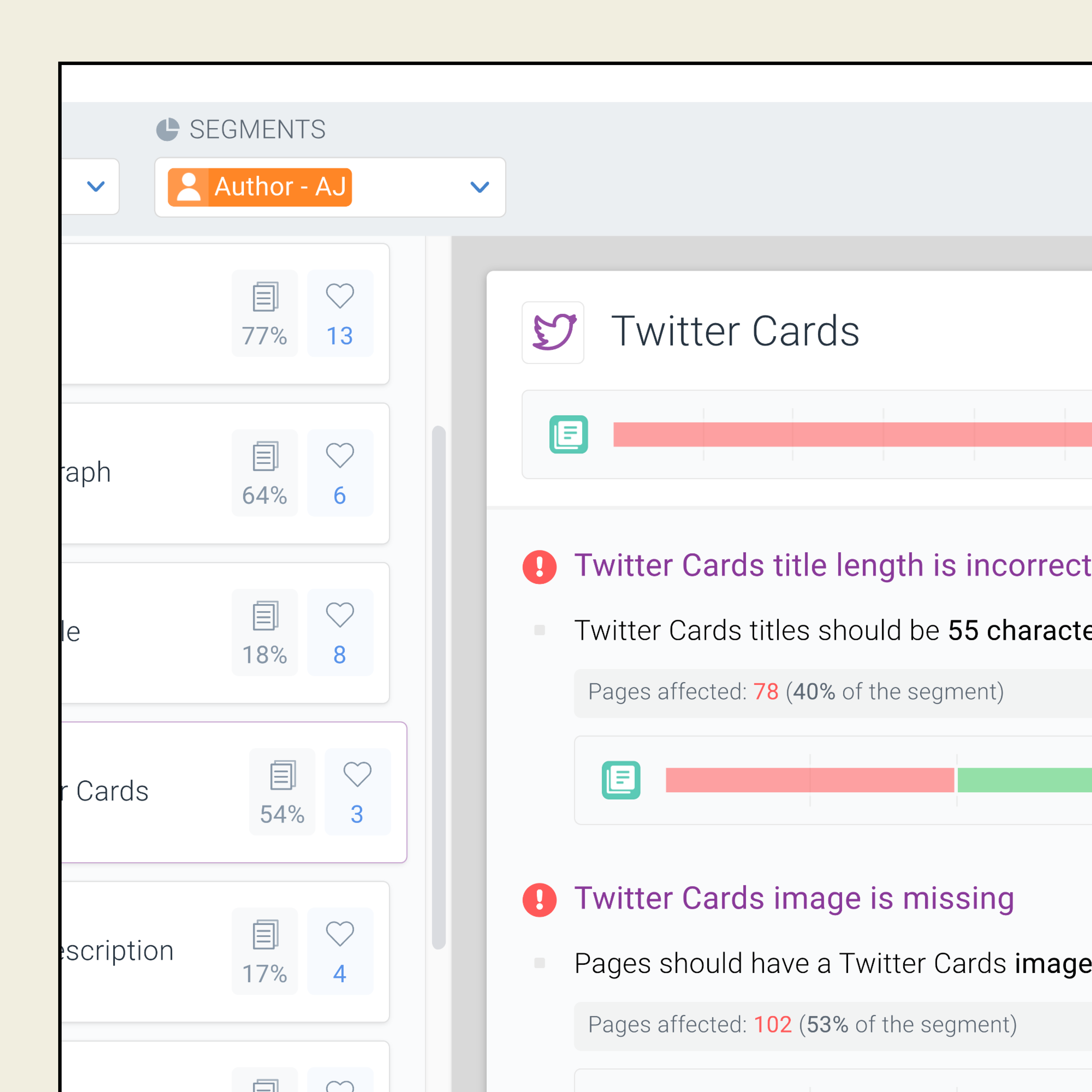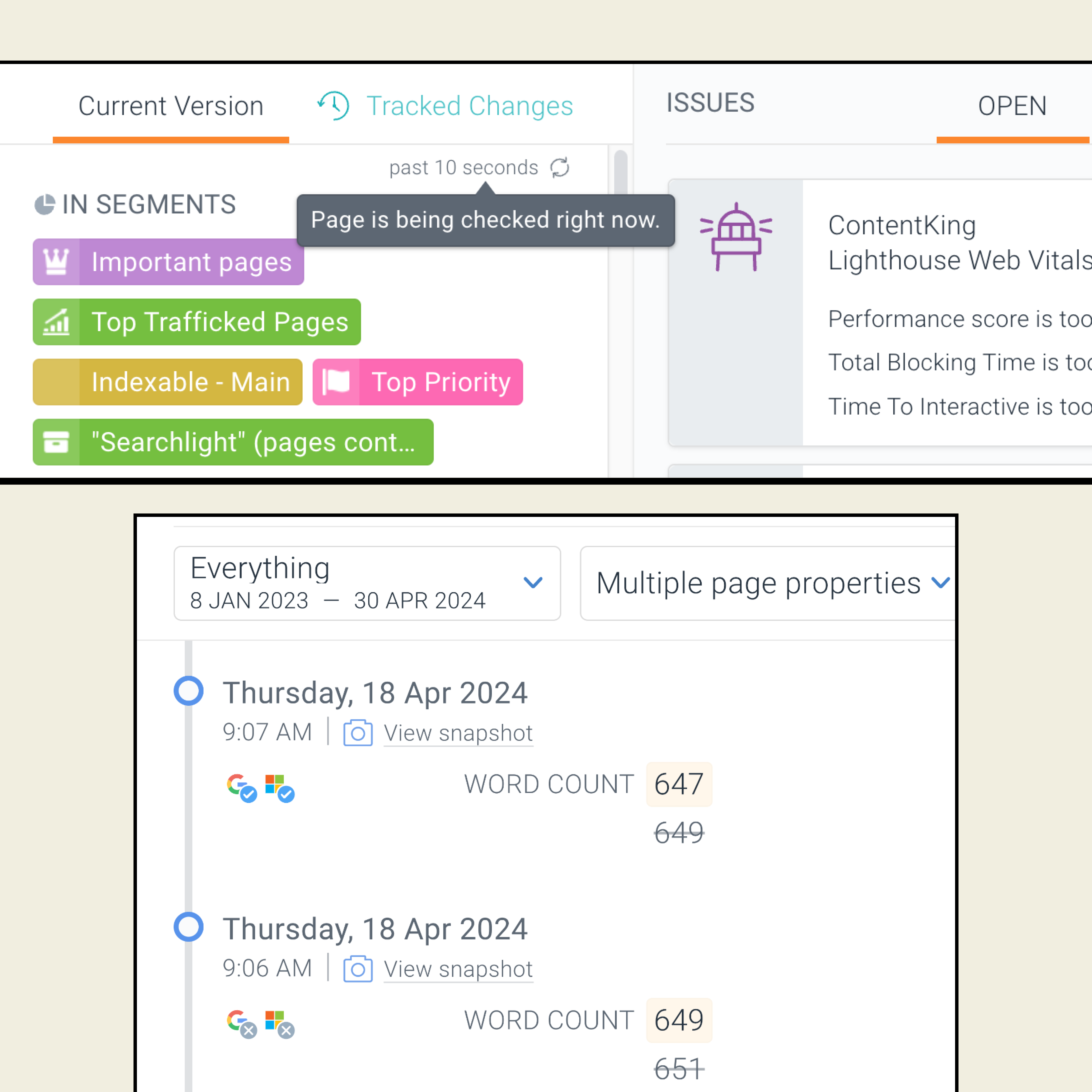 Find valuable opportunities across every page—no matter how many pages you have—with monitoring that continuously combs through all your content and uses heuristics to recommend the most impactful optimizations.