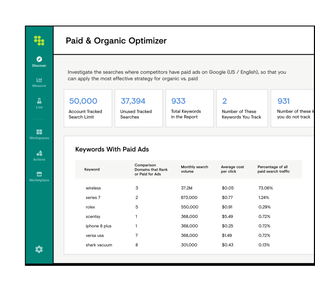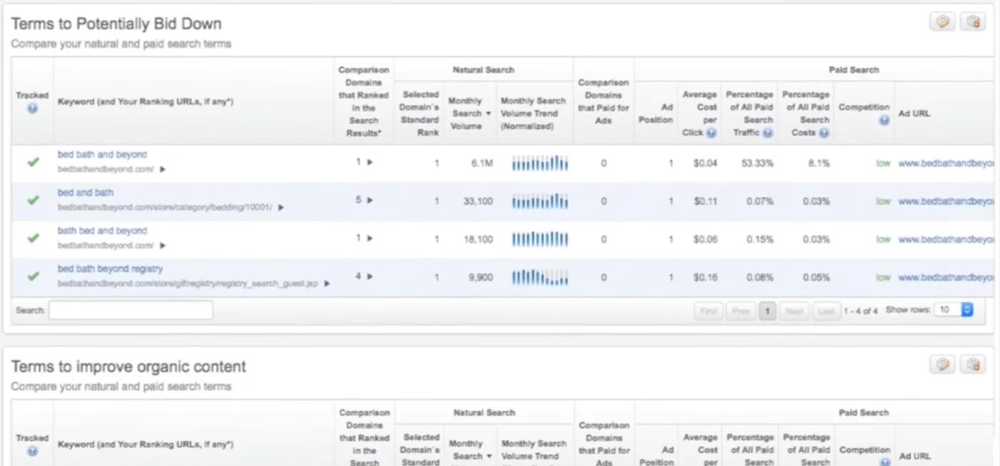 Find new bidding and content creation opportunities by viewing your organic and paid keywords together.
